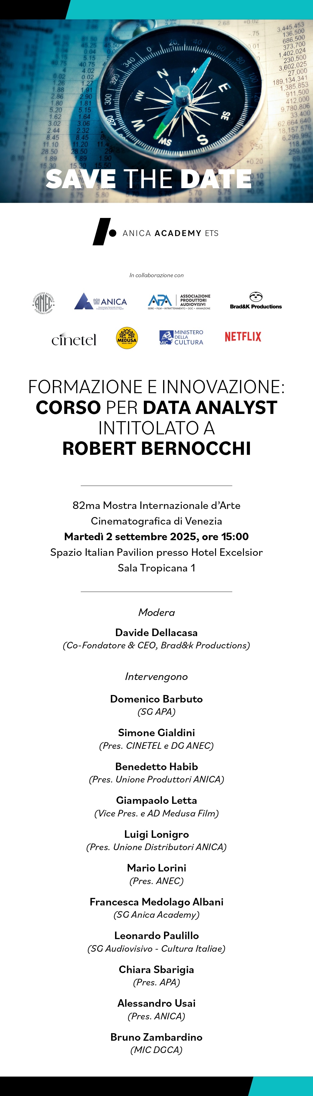 Siamo lieti di inoltrare l'invito alla presentazione del Corso per Data Analyst intitolato a Robert Bernocchi che ANICA ACADEMY ETS ha in programma il 2 settembre 2025 alle ore 15 presso l’ Italian Pavilion (Hotel Excelsior, Sala Tropicana 1), nell'ambito della 82ma Mostra Internazionale d'Arte Cinematografica di Venezia, in collaborazione con ANEC, ANICA, APA, Brad&k Productions, Cinetel, Medusa, MiC - DGCA e Netflix.