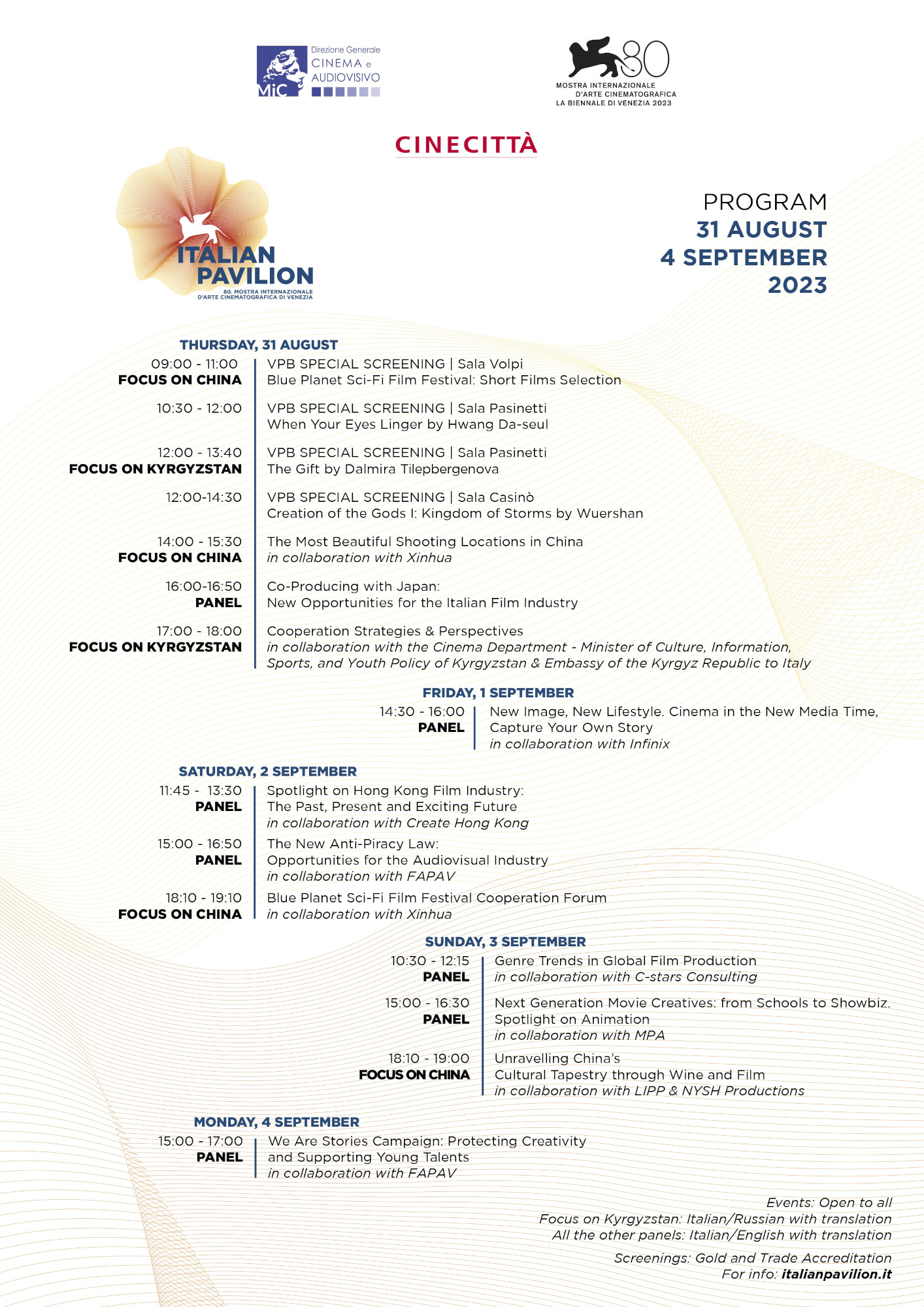 Cari AssociatiInoltriamo il programma degli eventi industry organizzati da Cinecittà per la Direzione Generale Cinema e Audiovisivo del Ministero della Cultura, dal 31 agosto al 4 settembre 2023 in occasione della 80. Mostra Internazionale d’Arte Cinematografica di Venezia (30 agosto - 9 settembre 2023).