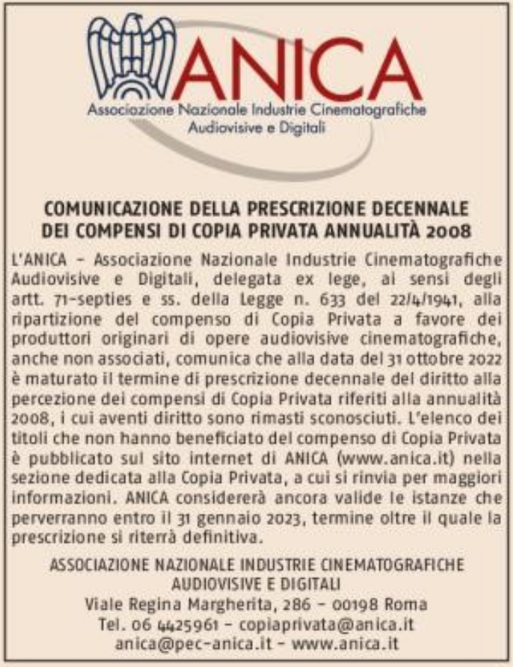 L’ANICA – Associazione Nazionale Industrie Cinematografiche Audiovisive e Digitali, delegata ex lege, ai sensi degli artt. 71-septies e ss. della Legge n. 633 del 22/4/1941, alla ripartizione del compenso di Copia Privata a favore dei produttori originari di opere audiovisive cinematografiche, anche non associati, comunica che alla data del 31 ottobre 2022 è maturato il termine di prescrizione decennale del diritto alla percezione dei compensi di Copia Privata riferiti alla annualità 2008, i cui aventi diritto sono rimasti sconosciuti. L’elenco dei titoli che non hanno beneficiato del compenso di Copia Privata è pubblicato sul sito internet di ANICA nella sezione dedicata alla Copia Privata, a cui si rinvia per maggiori informazioni. ANICA considererà ancora valide le istanze che perverranno entro il 31 gennaio 2023, termine oltre il quale la prescrizione si riterrà definitiva.