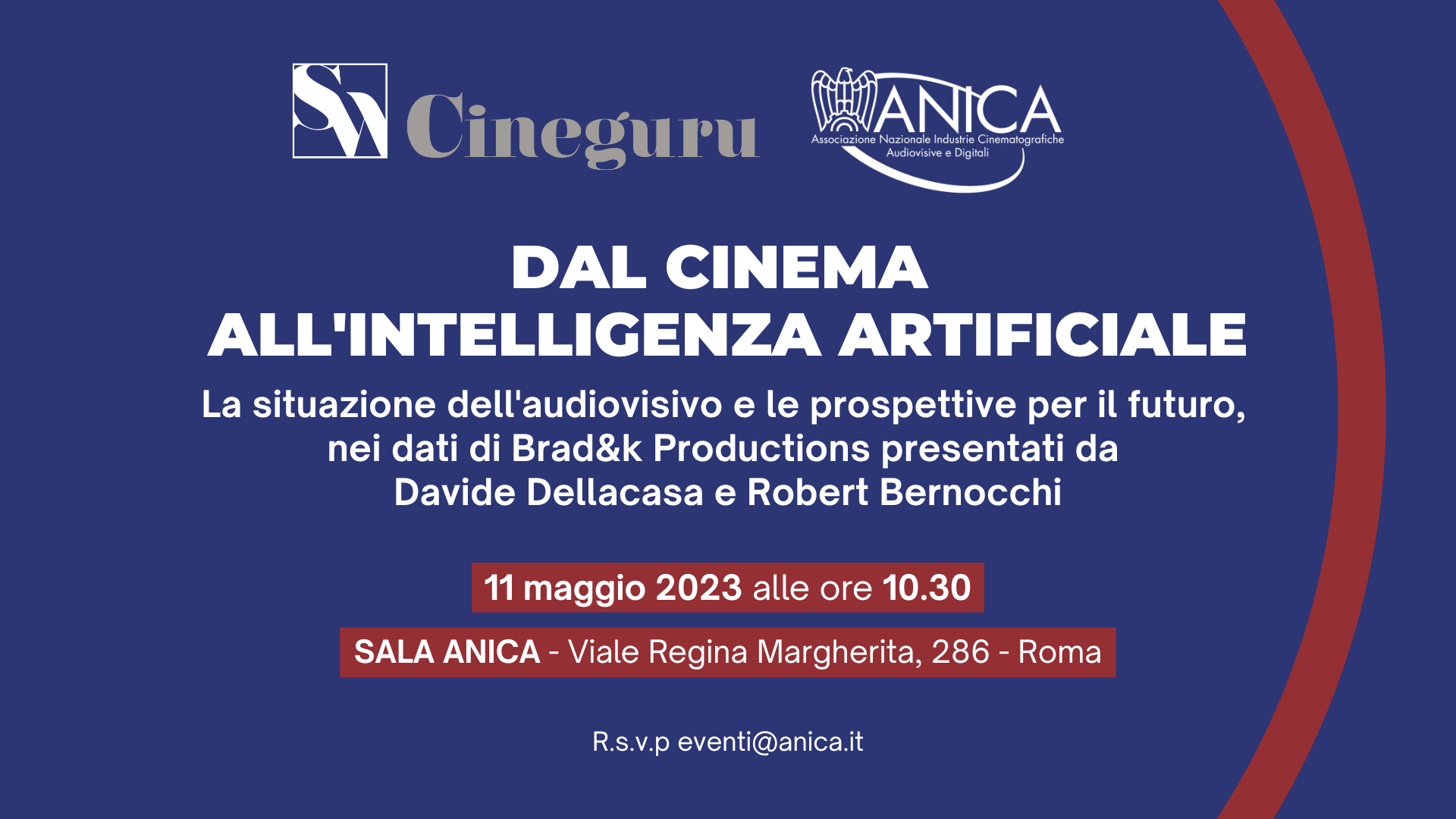 Cari Associati Giovedì 11 maggio 2023 a partire dalle ore 10.30 presso la sala ANICA si terrà l'evento "DAL CINEMA ALL'INTELLIGENZA ARTIFICIALE. La situazione dell'audiovisivo e le prospettive per il futuro, nei dati di Brad&k Productions presentati da Davide Dellacasa e Robert Bernocchi". Si prega di confermare la propria presenza alla mail
