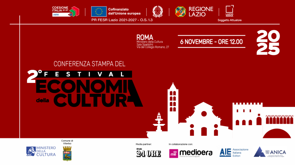 Giovedì 6 novembre 2025 alle ore 12 presso la “Sala Spadolini” del Ministero della Cultura (in via del Collegio Romano 27) si terrà la conferenza di presentazione del “Festival Economia della Cultura”, la seconda edizione della manifestazione internazionale promossa dalla Regione Lazio e realizzata da Lazio Innova con il patrocinio del Ministero della Cultura.