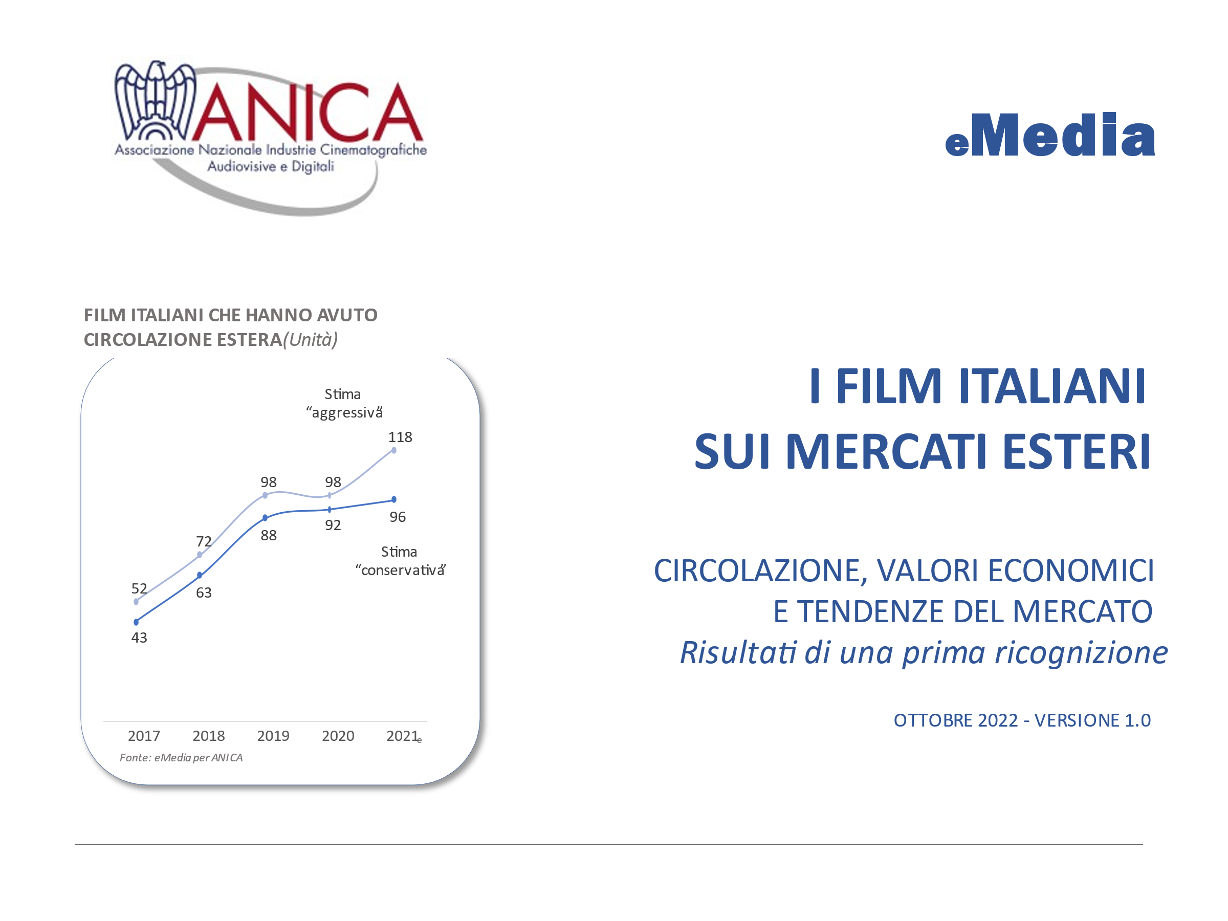 Nel contesto della costante evoluzione del mercato audiovisivo, la circolazione sui mercati mondiali dei film nazionali costituisce un importante elemento per comprendere e misurare la vitalità e la competitività dell’industria italiana del film. In occasione dell’Edizione 2022 del MIA Mercato Internazionale Audiovisivo (11–15 ottobre), ANICA e eMedia presentano i risultati di uno studio che propone alcuni primi dati (circolazione estera, capacità di collaborazione con partner internazionali, stima dei valori economici generati) sulla proiezione internazionale dei film di origine italiana, prodotti per la sala cinematografica, la televisione e il VOD nel quinquennio 2017-2021. La ricerca, inoltre, propone alcune aree di analisi sul contesto di mercato e strategico in cui si determinano le prospettive e le potenzialità per l’internazionalizzazione della produzione e distribuzione dei titoli italiani. 9.30 Saluti e benvenuto – Francesco Rutelli 9.35 Introduzione – Francesca Medolago Albani – moderatrice 9.45 Presentazione ricerca – Emilio Pucci – eMedia 10.15 Riflessioni e discussione sulle prime evidenze – Nicola Borrelli, Carlotta Calori, Micaela Fusco, Cristian Jezdic, Andrea Occhipinti 10.40 Insights sui prossimi passi e conclusioni