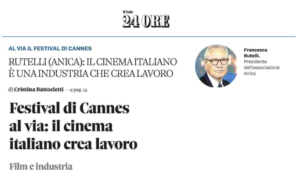 IL SOLE 24 ORE. AL VIA IL FESTIVAL DI CANNES. RUTELLI (ANICA): IL CINEMA ITALIANO È UNA INDUSTRIA CHE CREA LAVORO Intervista di Cristina Battocletti