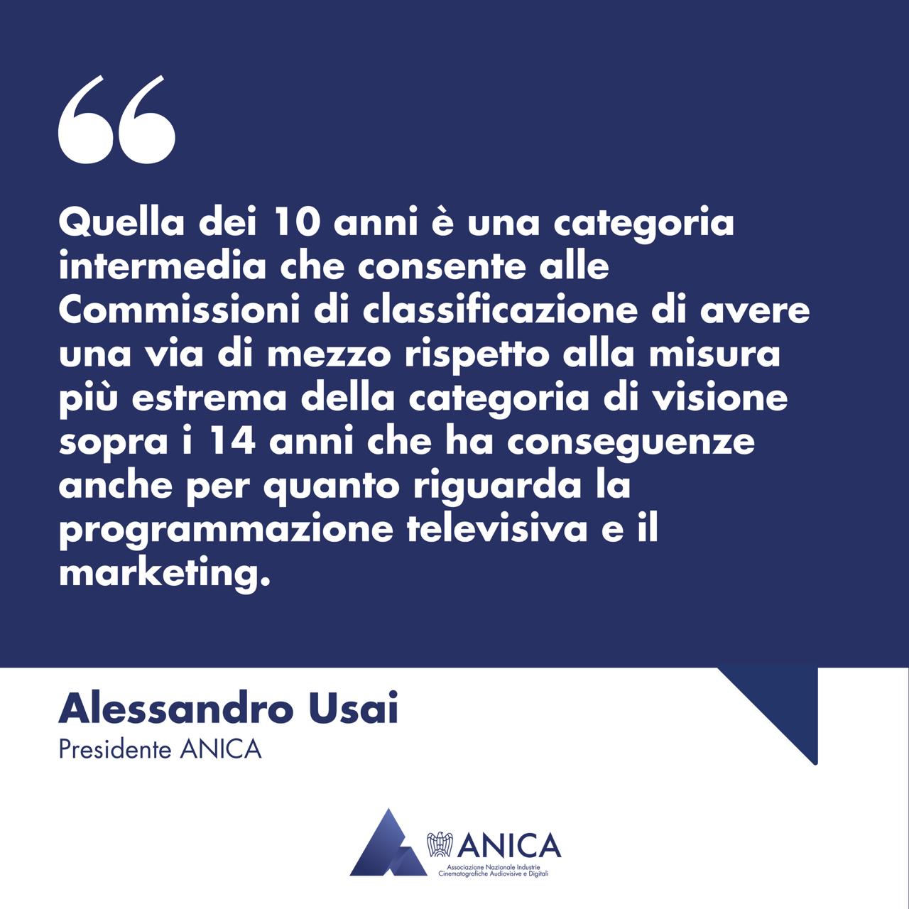 "Il nostro comparto, nel provvedimento, è toccato solo per l'introduzione della nuova categoria di classificazione delle opere cinematografiche e l'Anica ci tiene a dire che sia i distributori sia i produttori sono d'accordo con l'introduzione di questa nuova categoria; perché seppure può sembrare l'introduzione di un nuovo elemento di vincolo, in realtà la vediamo come un'opportunità perché introduce una categoria intermedia nella fascia che attualmente va tra i 6 e i 14 anni", ha spiegato Usai.