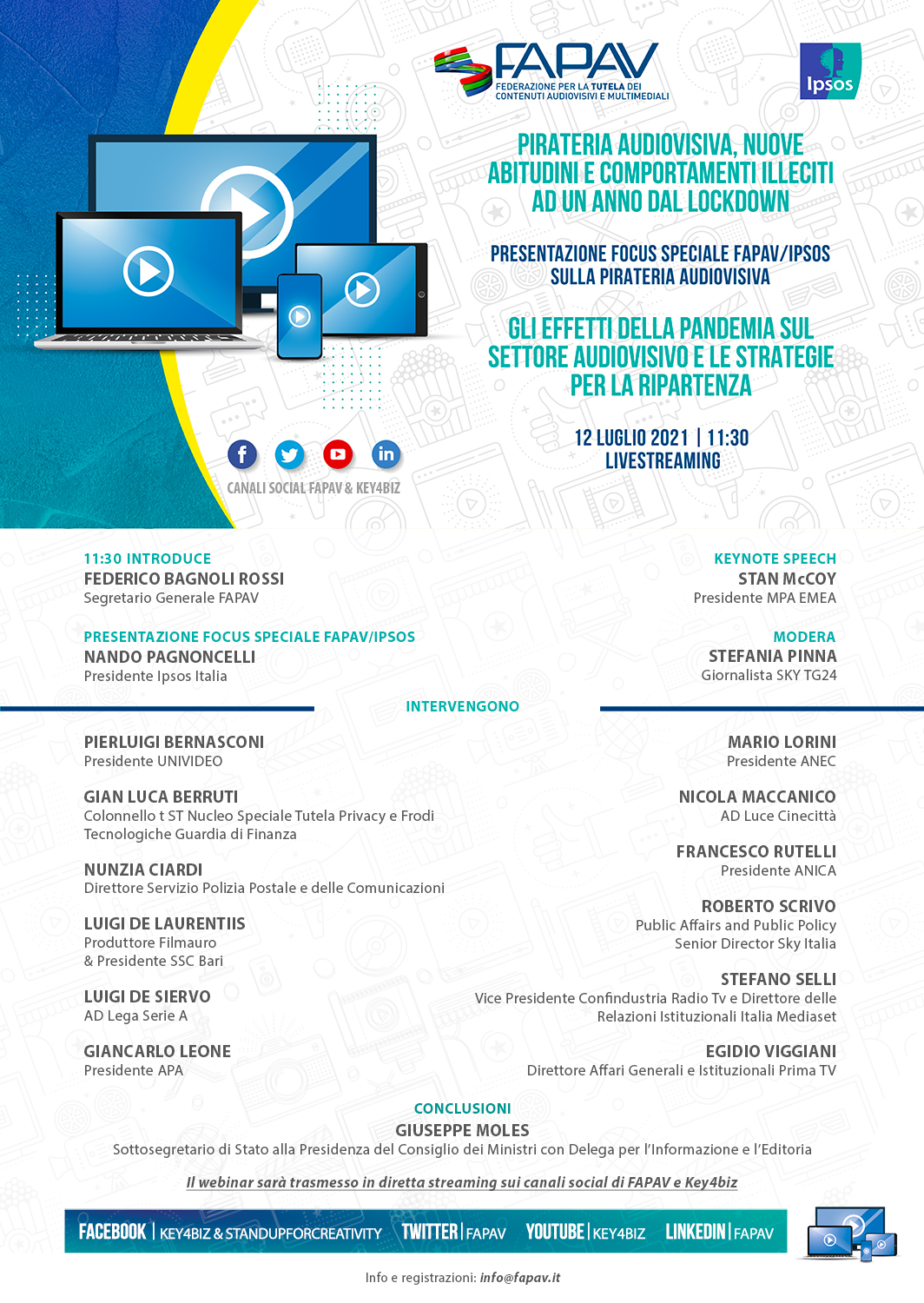 Definito il programma completo della presentazione del Focus speciale FAPAV/Ipsos sulla pirateria audiovisiva a un anno dal lockdown. L’evento sarà trasmesso lunedì 12 luglio alle ore 11:30 in diretta streaming sui canali social FAPAV e Key4biz: FACEBOOK: Stand Up For Creativity e Key4biz TWITTER: @FAPAV_IT YOUTUBE: Key4biz Info e registrazioni: