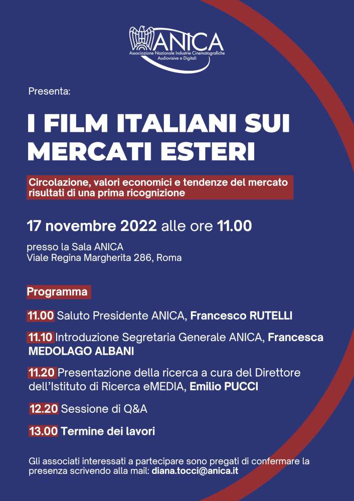 Inoltriamo a seguire l'invito alla presentazione integrale della prima ricognizione della ricerca ANICA sull'export di film italiani, che fa seguito all’illustrazione di un estratto agli accreditati al MIA Market, avvenuta lo scorso 12 ottobre.