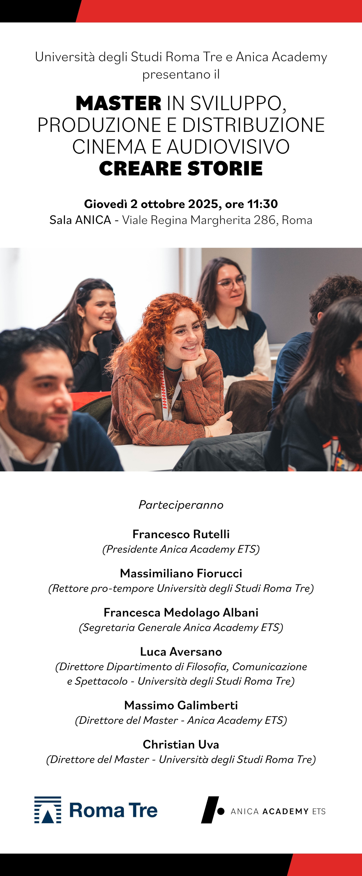 Siamo lieti di inoltrare l'invito alla presentazione della nuova edizione di Creare Storie, che diventa Master di Primo Livello, istituito dall’Università degli Studi Roma Tre e Anica Academy ETS, in programma per gennaio 2026.