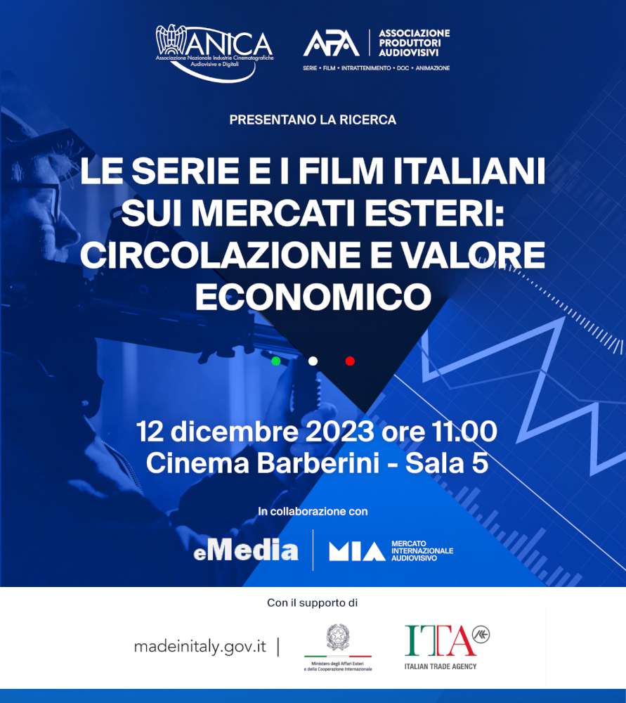 ANICA (Associazione Nazionale Industrie Cinematografiche Audiovisive e Digitali) e APA (Associazione Produttori Audiovisivi) presentano la ricerca “LE SERIE E I FILM ITALIANI SUI MERCATI ESTERI: CIRCOLAZIONE E VALORE ECONOMICO", che si terrà il 12 dicembre 2023 alle ore 11.00 presso la Sala 5 del Cinema Barberini (Piazza Barberini, 24/26 - Roma).