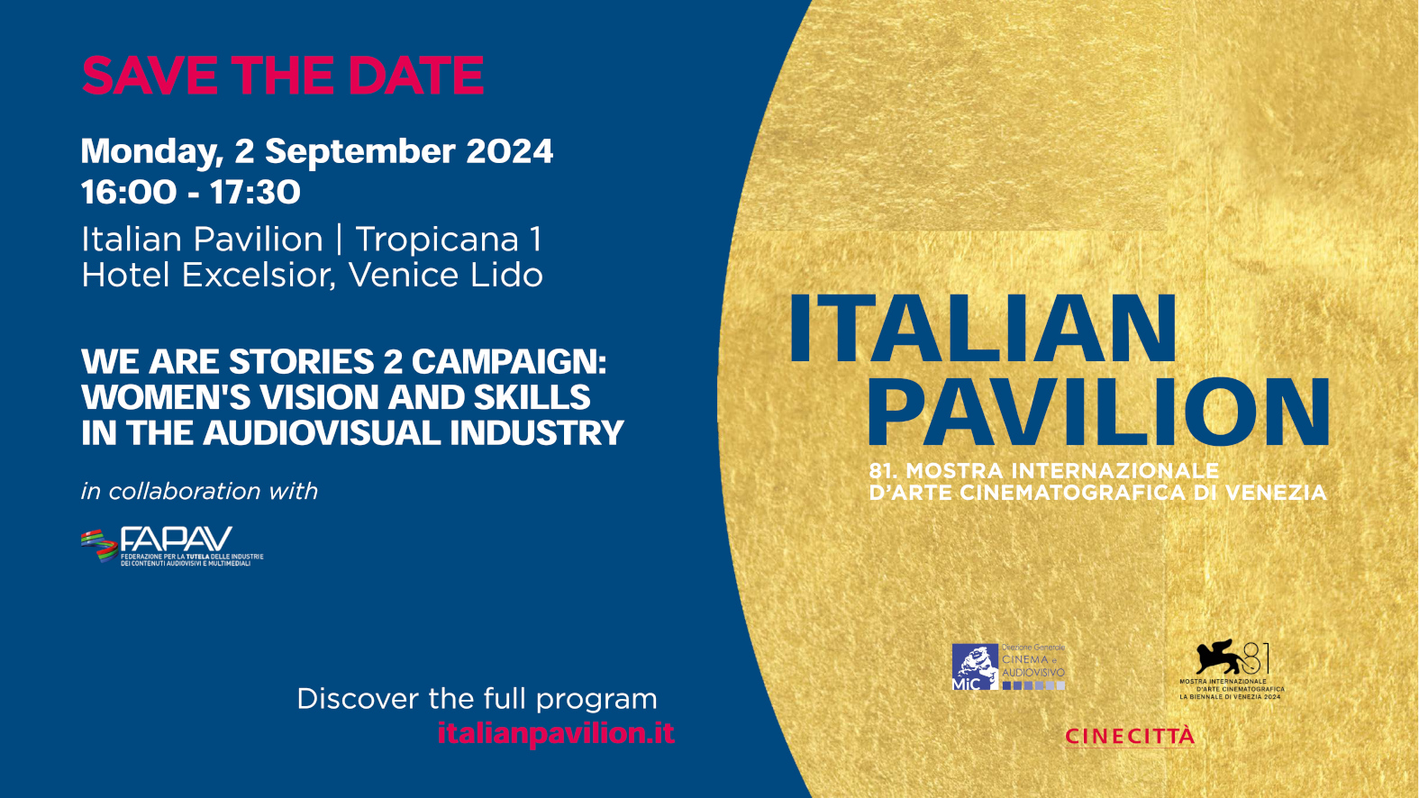 Cari Associati Inoltriamo il save the date e l’agenda aggiornata dell’evento “We Are Stories 2” Campaign: Women's Vision and Skills in the Audiovisual Industries, organizzato dalla Direzione Generale Cinema e Audiovisivo del Ministero della Cultura in collaborazione con FAPAV, che si terrà lunedì 2 settembre dalle ore 16:00 alle 17:30 presso l'Italian Pavilion, all'Hotel Excelsior del Lido di Venezia, in occasione dell’81. Mostra Internazionale d'Arte Cinematografica di Venezia. Nel corso della conferenza sarà presentata ufficialmente e lanciata la seconda edizione della campagna istituzionale antipirateria “We Are Stories”, nata grazie all’impegno di FAPAV in collaborazione con ANEC, ANICA, APA, CRTV, MPA, NUOVOIMAIE, SIAE e UNIVIDEO.