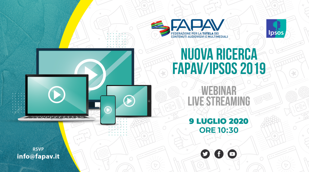 Trasmettiamo il save the date del webinar FAPAV/IPSOS, previsto per il 9 luglio alle ore 10:30, durante il quale sarà presentata la nuova indagine sulla pirateria audiovisiva in Italia.