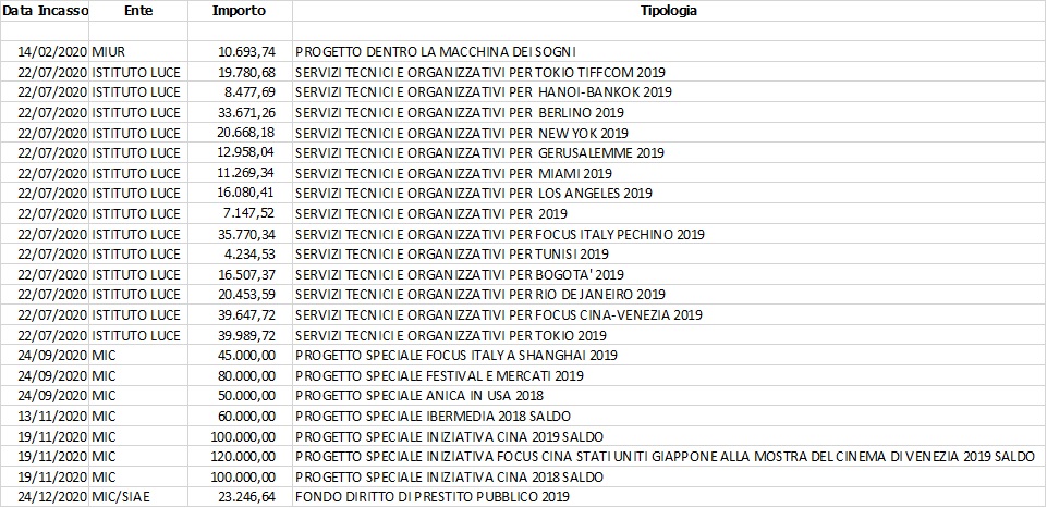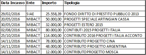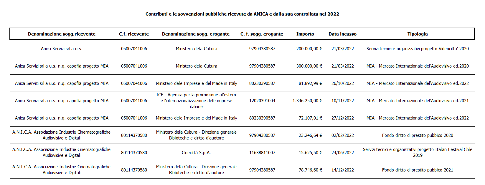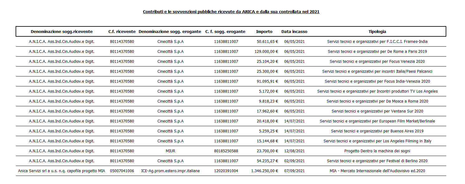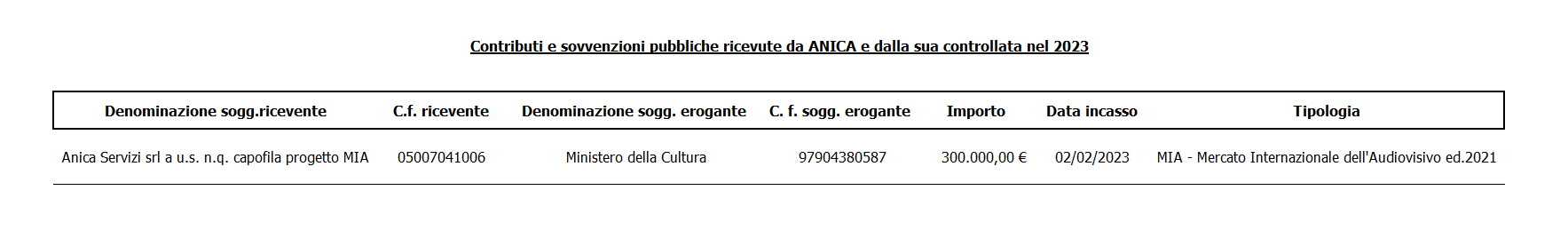 In quest’area sono riportati i contributi e le sovvenzioni pubbliche ricevute da ANICA e dalla sua controllata.